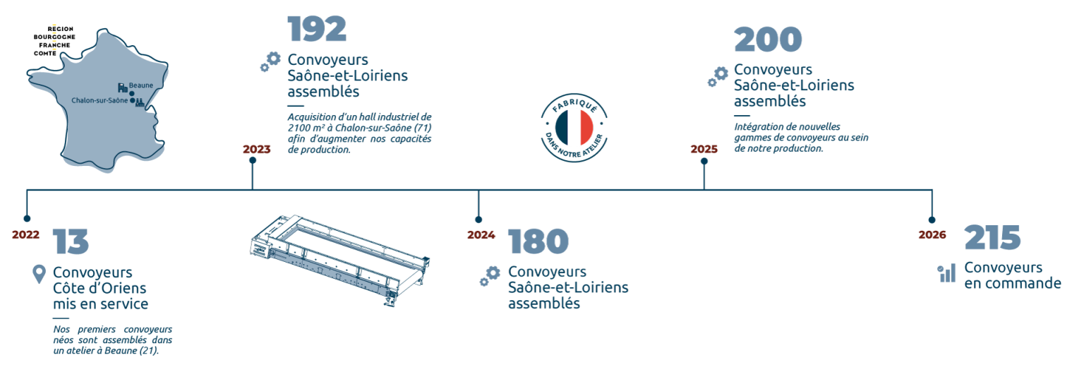 À partir de 2022, néos a engagé la relocalisation progressive de l’assemblage de ses convoyeurs en Bourgogne–Franche-Comté, sur son site de Crissey (71).